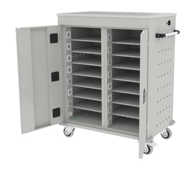 Laptops und Notebooks werden im mobilen Laptopwagen verschlossen und geladen. Jedes der Schliessfächer beinhaltet eine Steckdosenleiste, die mit Überspannungsschutz sowie 2 Sicherungen ausgestattet ist. Mittels Status-LED wird angezeigt, dass alles ordnungsgemäss funktioniert. An der Aussenseite befinden sich der Hauptschalter und der Anschluss für das Netzkabel. Die Seiten und die Rückwand sind mit Lüftungsschlitzen versehen und sorgen somit für genügend Luftzirkulation. Die Oberseite ist als Arbeitspult bei Präsentationen geeignet. Die Ecken sind mit einem Anfahrschutz versehen. Ebenfalls sind im Lieferumfang zwei Handgriffe vorhanden, die bei Bedarf an den Seiten oder auf der Arbeitsplatte montiert werden können.