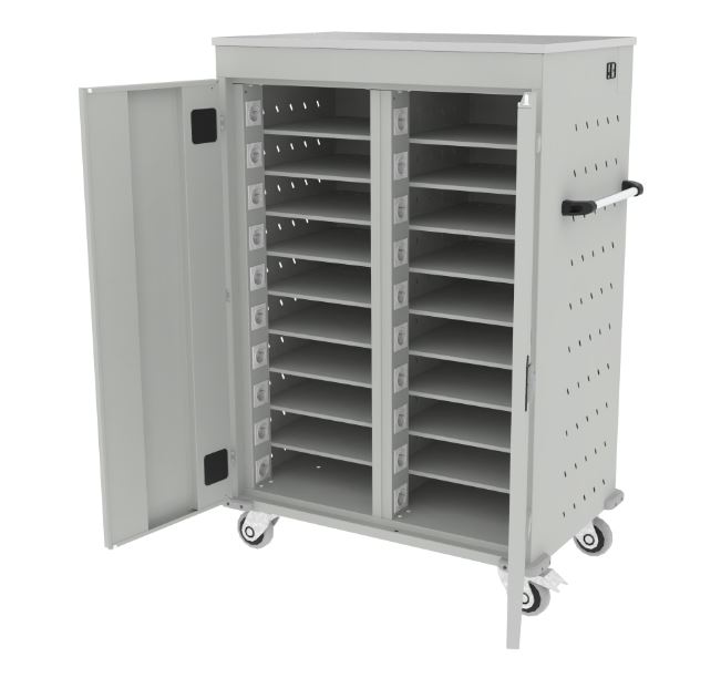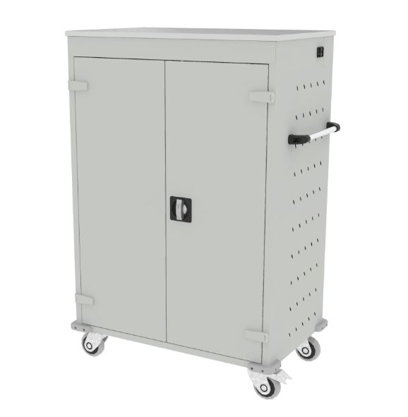 Laptops und Notebooks werden im mobilen Laptopwagen verschlossen und geladen. Jedes der Schliessfächer beinhaltet eine Steckdosenleiste, die mit Überspannungsschutz sowie 2 Sicherungen ausgestattet ist. Mittels Status-LED wird angezeigt, dass alles ordnungsgemäss funktioniert. An der Aussenseite befinden sich der Hauptschalter und der Anschluss für das Netzkabel. Die Seiten und die Rückwand sind mit Lüftungsschlitzen versehen und sorgen somit für genügend Luftzirkulation. Die Oberseite ist als Arbeitspult bei Präsentationen geeignet. Die Ecken sind mit einem Anfahrschutz versehen. Ebenfalls sind im Lieferumfang zwei Handgriffe vorhanden, die bei Bedarf an den Seiten oder auf der Arbeitsplatte montiert werden können.