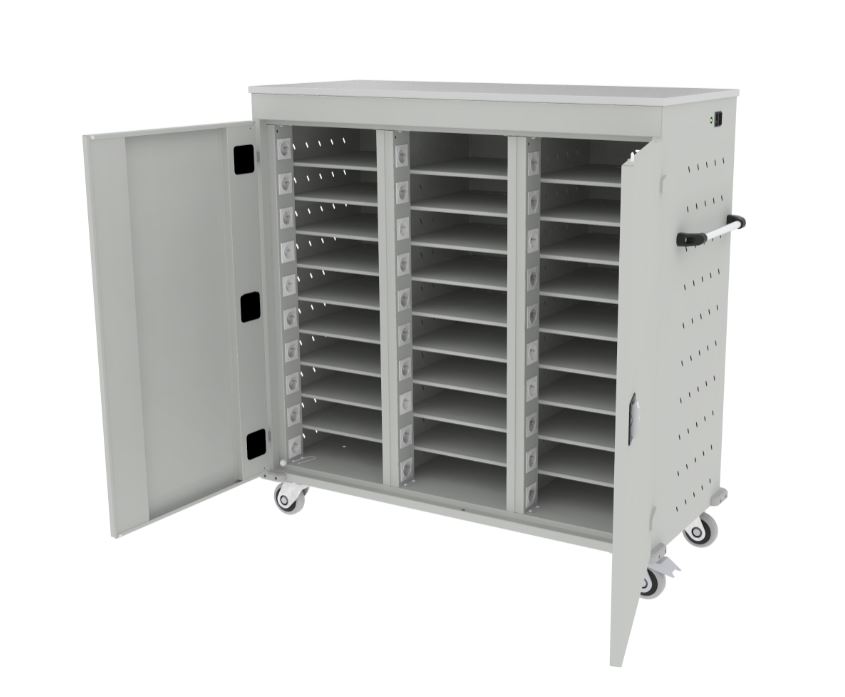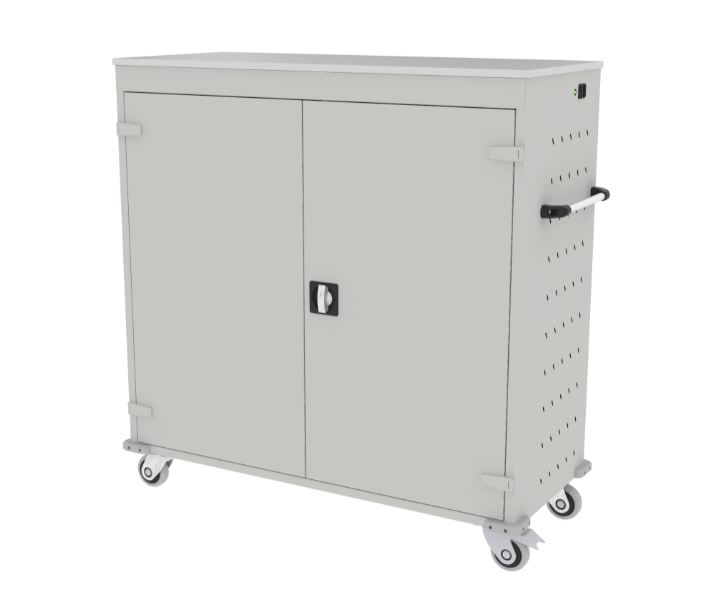 Laptops und Notebooks werden im mobilen Laptopwagen verschlossen und geladen. Jedes der Schliessfächer beinhaltet eine Steckdosenleiste, die mit Überspannungsschutz sowie 2 Sicherungen ausgestattet ist. Mittels Status-LED wird angezeigt, dass alles ordnungsgemäss funktioniert. An der Aussenseite befinden sich der Hauptschalter und der Anschluss für das Netzkabel. Die Seiten und die Rückwand sind mit Lüftungsschlitzen versehen und sorgen somit für genügend Luftzirkulation. Die Oberseite ist als Arbeitspult bei Präsentationen geeignet. Die Ecken sind mit einem Anfahrschutz versehen. Ebenfalls sind im Lieferumfang zwei Handgriffe vorhanden, die bei Bedarf an den Seiten oder auf der Arbeitsplatte montiert werden können.