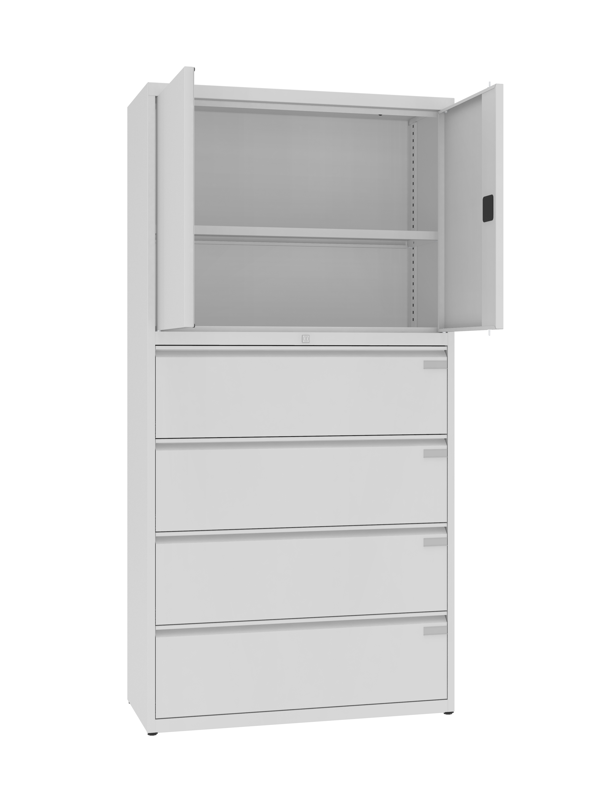 Metallschrank mit Akten- und Hängeregistraturfunktion – robust und sofort einsatzbereit Dieser hochwertige Metallschrank vereint praktische Aufbewahrung und durchdachte Funktionalität. Der obere Teil des Schranks bietet Platz für zwei Reihen Aktenordner und ist dank höhenverstellbarer...