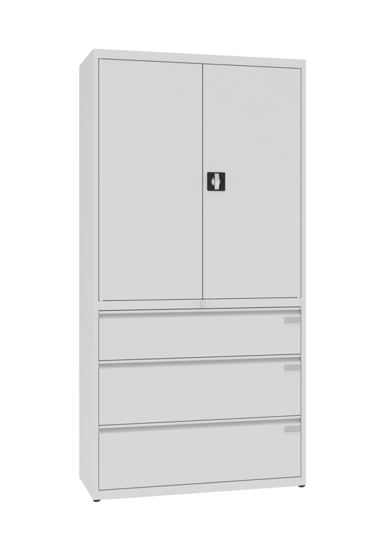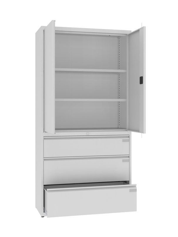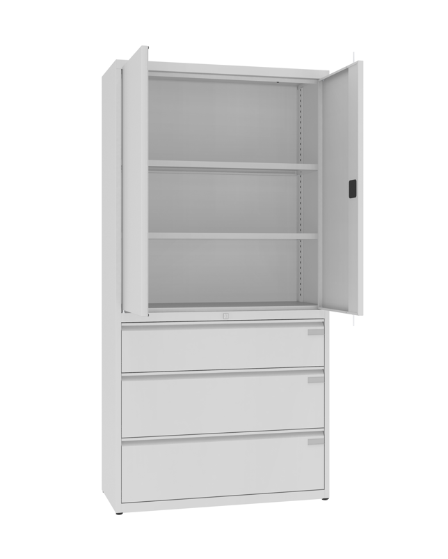Dieser hochwertige Metallschrank vereint praktische Aufbewahrung und durchdachte Funktionalität. Der obere Teil des Schranks bietet Platz für zwei Reihen Aktenordner und ist dank höhenverstellbarer Fachböden alle 2.5 cm flexibel an Ihre Bedürfnisse anpassbar.