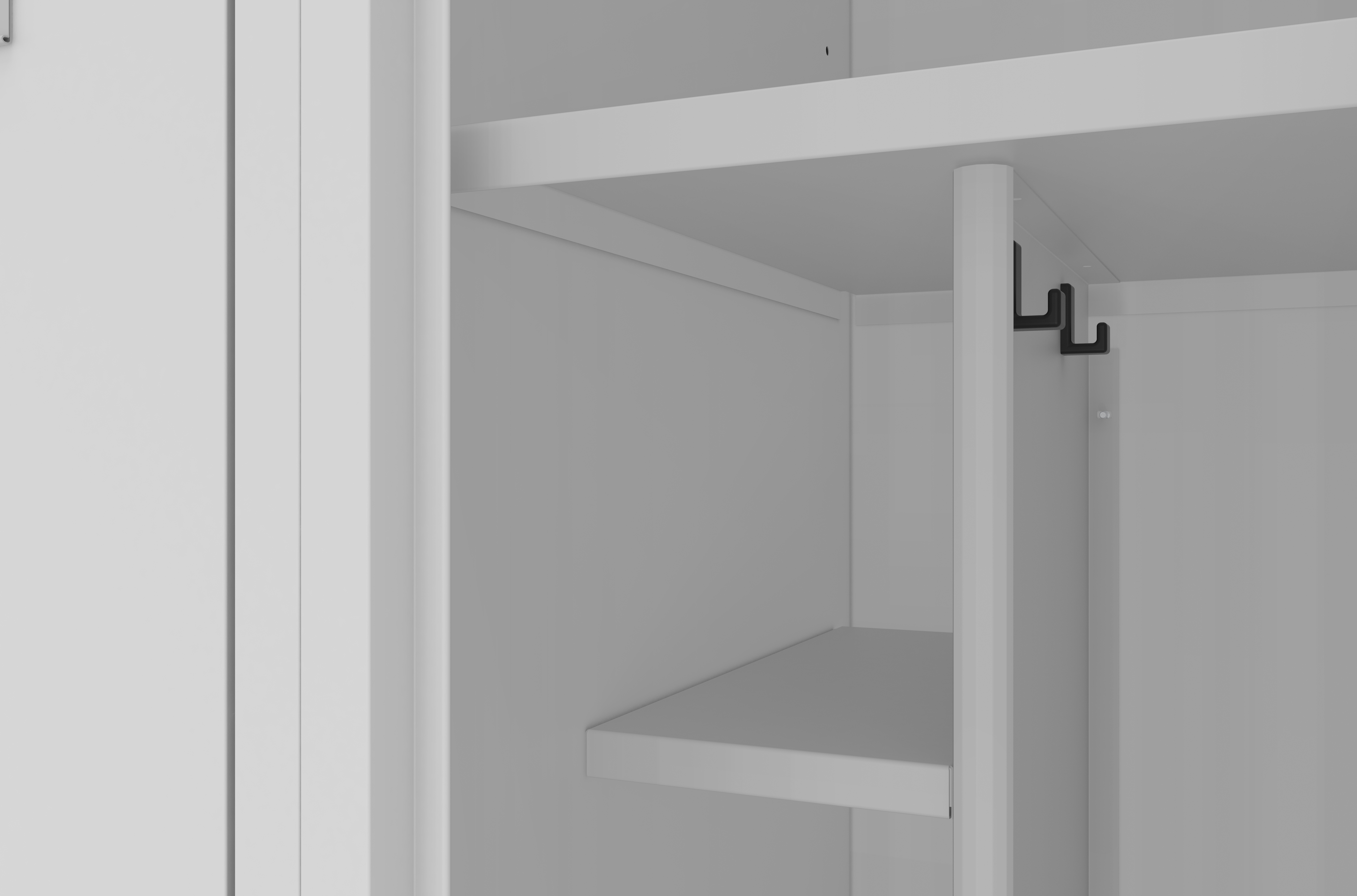 Funktionaler Garderobenschrank mit oberem Hutfachboden, unterem Schuhfach sowie integriertem Bücherfach. Auf der rechten Seite befinden sich zwei praktische Kleiderhaken. Die Tür mit eingetragenem Industriedesign verleiht dem Garderobenschrank einen modernen Look.
