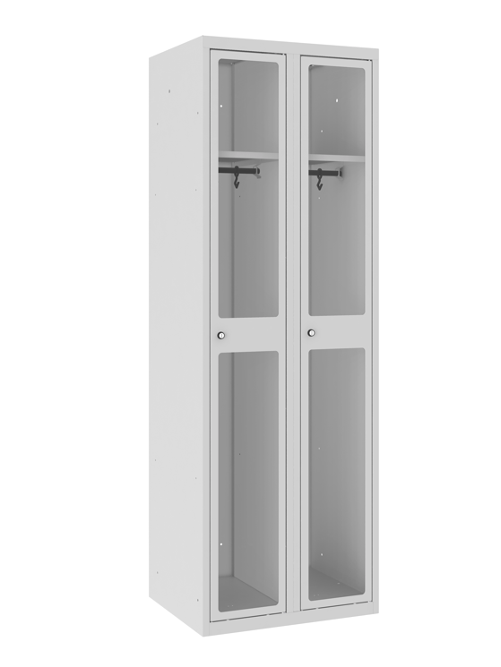 Dieser Garderobenschrank besteht aus zwei Abteilen und gehört zur modernsten Ausführung. Der Korpus ist aus stabilem Stahlblech konstruiert und in 14 verschiedenen RAL-Farben hochwertig lackiert erhältlich. Das Innenleben des Garderobenschrankes ist mit einem fest verschweissten Fachboden, einer Kleiderstange und mit zwei verschiebbaren Haken ausgestattet. Die Türen sind aus 4 mm dickem Plexiglas Sichtfenster gefertigt und zusätzlich mit einem Profil von innen verstärkt. Dank der integrierten Gummipuffer werden Geräusche beim Schliessen gedämpft. Den Verschluss gibt es serienmässig in zwei verschiedenen Ausführungen. Zum einen gibt es das Zylinderschloss mit zwei Schlüsseln und zum andern der Drehriegel für Vorhängeschloss.