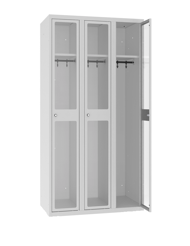 Dieser Garderobenschrank besteht aus drei Abteilen und gehört zur modernsten Ausführung. Der Korpus ist aus stabilem Stahlblech konstruiert und in 14 verschiedenen RAL-Farben hochwertig lackiert erhältlich. Das Innenleben des Garderobenschrankes ist mit einem fest verschweissten Fachboden, einer Kleiderstange und mit zwei verschiebbaren Haken ausgestattet. Die Türen sind aus 4 mm dickem Plexiglas Sichtfenster gefertigt und zusätzlich mit einem Profil von innen verstärkt. Dank der integrierten Gummipuffer werden Geräusche beim Schliessen gedämpft. Den Verschluss gibt es serienmässig in zwei verschiedenen Ausführungen. Zum einen gibt es das Zylinderschloss mit zwei Schlüsseln und zum andern der Drehriegel für Vorhängeschloss.