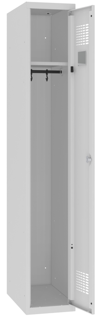 Im Inneren sorgen ein fester Fachboden, eine robuste Kleiderstange mit drei verschiebbaren Haken sowie ein zusätzlicher Handtuchhaken für maximale Ordnung. Die verstärkte Tür mit stilvollen Lüftungsschlitzen schliesst dank integrierter Gummipuffer besonders leise.