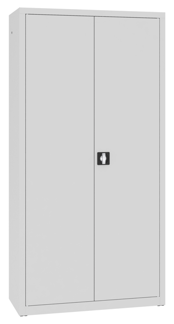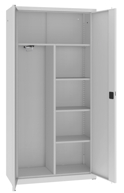 Der Türgriff ist mit einem Verriegelungsmechanismus ausgestattet, der die Türen in zwei Punkten sichert. Im inneren dieses Schrankes befinden sich drei halbe und ein ganzer Fachboden sowie eine Kleiderstange für Kleiderbügel. Die Tragfähigkeit beträgt ca. 50 kg pro Fachboden.
