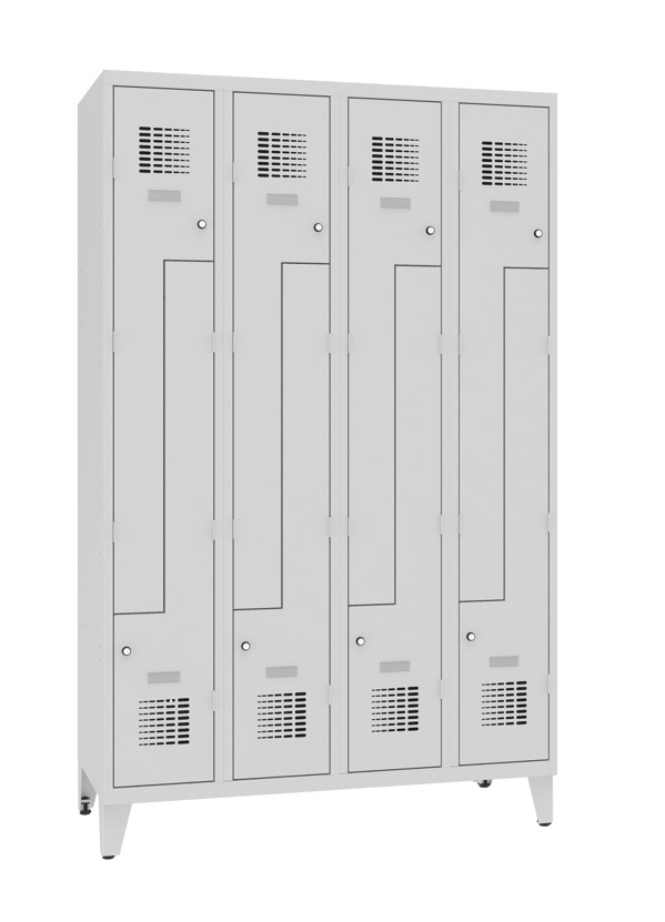 Dieser platzsparende Z-Garderobenschrank besteht aus vier Abteilen mit acht Fächern und ist in klassischer Ausführung komplett verschweisst. Der Korpus ist aus stabilem Stahlblech modern konstruiert worden. Das Innenleben des Garderobenschrankes ist pro Fach mit einer Kleiderstange und mit zwei verschiebbaren Haken ausgestattet. Die Türen sind aus stabilem Stahlblech gefertigt und zusätzlich mit einem Profil von innen verstärkt. Die modern designten Lüftungslöcher heben die Optik des Garderobenschrankes deutlich hervor. Den Korpus und die Türen gibt es in 14 verschiedenen RAL-Farben hochwertig lackiert, frei nach Ihrer Wahl. Dank der integrierten Gummipuffer werden Geräusche beim Schliessen gedämpft. Den Verschluss gibt es serienmässig in zwei verschiedenen Ausführungen. Zum einen gibt es das Zylinderschloss mit zwei Schlüsseln und zum andern das Vorhängeschloss mit Drehriegel.