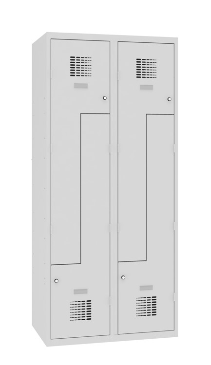 Dieser platzsparende Z-Garderobenschrank besteht aus zwei Abteilen mit vier Fächern und ist in klassischer Ausführung komplett verschweisst. Der Korpus ist aus stabilem Stahlblech modern konstruiert worden. Das Innenleben des Garderobenschrankes ist pro Fach mit einer Kleiderstange und mit zwei verschiebbaren Haken ausgestattet. Die Türen sind aus stabilem Stahlblech gefertigt und zusätzlich mit einem Profil von innen verstärkt. Die modern designten Lüftungslöcher heben die Optik des Garderobenschrankes deutlich hervor. Den Korpus und die Türen gibt es in 14 verschiedenen RAL-Farben hochwertig lackiert, frei nach Ihrer Wahl. Dank der integrierten Gummipuffer werden Geräusche beim Schliessen gedämpft. Den Verschluss gibt es serienmässig in zwei verschiedenen Ausführungen. Zum einen gibt es das Zylinderschloss mit zwei Schlüsseln und zum andern das Vorhängeschloss mit Drehriegel.