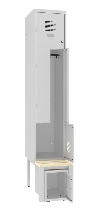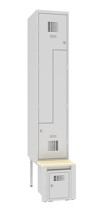 Dieser platzsparende Z-Garderobenschrank besteht aus zwei Abteilen mit zwei Fächern und ist in klassischer Ausführung komplett verschweisst. Der Korpus ist aus stabilem Stahlblech modern konstruiert worden. Das Innenleben des Garderobenschrankes ist pro Fach mit einer Kleiderstange und mit zwei...