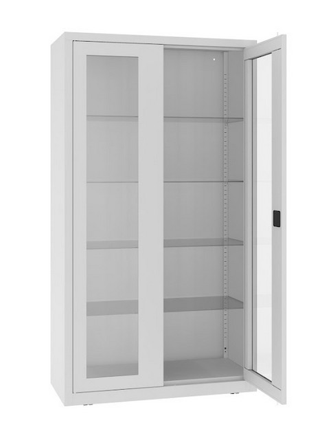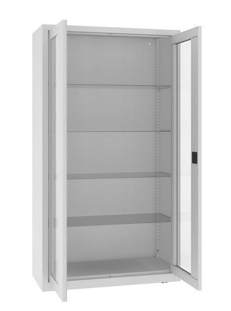 Robuster Korpus aus Stahlblech mit einer Materialstärke von 0,7–1,0 mm Flügeltüren mit Sichtfenster aus 4 mm starkem, gehärtetem Sicherheitsglas Höhenverstellbare Fachböden im 25-mm-Raster für flexible Innenaufteilung Fachböden aus 5 mm starkem, gehärtetem Glas Ergonomischer Türgriff mit...