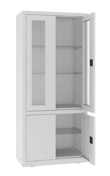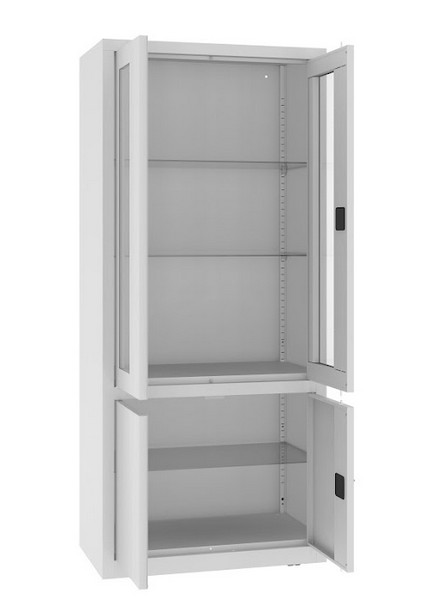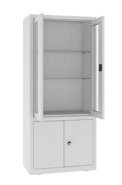 Robuster Korpus aus Stahlblech mit einer Materialstärke von 0,7–1,0 mm Oberer Teil mit Sichtfenster Unterer Teil mit Vollblechtür Höhenverstellbare Fachböden im 25-mm-Raster für flexible Innenaufteilung Fachböden aus 5 mm starkem, gehärtetem Glas Ergonomischer Türgriff mit...