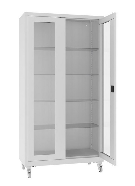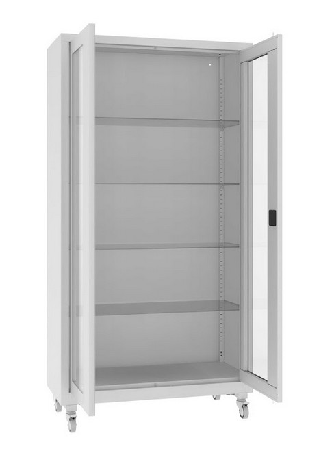Robuster Korpus aus Stahlblech mit einer Materialstärke von 0,7–1,0 mm Flügeltüren mit Sichtfenster aus 4 mm starkem, gehärtetem Sicherheitsglas Höhenverstellbare Fachböden im 25-mm-Raster für flexible Innenaufteilung Fachböden aus 5 mm starkem, gehärtetem Glas Ergonomischer Türgriff mit...