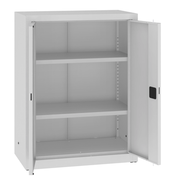 Hier handelt es sich um einen Metallschrank mit Flügeltüren. Der versenkte Türgriff ist mit einem Sicherheitszylinderschloss ausgestattet, der die Tür mit einem Verriegelungsmechanismus an zwei Punkten sichert. Integrierte Gummipuffer sorgen für eine Geräuschdämmung beim Schliessen der Türen. Die Fachböden sind alle 25 mm einstellbar. Die Tragfähigkeit beträgt 65 kg pro Fachboden. Der Korpus ist komplett verschweisst und sehr robust gefertigt. Der Metallschrank muss nicht zusammengebaut werden, wodurch er an Festigkeit und Stabilität gewinnt. Der Korpus ist mit Gleitern am Schrankboden ausgestattet, die ein leichtes Verschieben des Schrankes ermöglichen.
