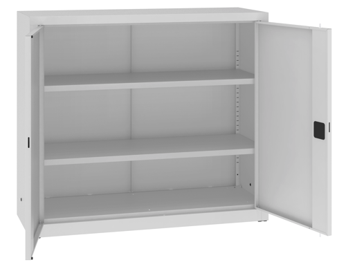 Hier handelt es sich um einen Metallschrank mit Flügeltüren. Der versenkte Türgriff ist mit einem Sicherheitszylinderschloss ausgestattet, der die Tür mit einem Verriegelungsmechanismus an zwei Punkten sichert. Integrierte Gummipuffer sorgen für eine Geräuschdämmung beim Schliessen der Türen. Die Fachböden sind alle 25 mm einstellbar. Die Tragfähigkeit beträgt 65 kg pro Fachboden. Der Korpus ist komplett verschweisst und sehr robust gefertigt. Der Metallschrank muss nicht zusammengebaut werden, wodurch er an Festigkeit und Stabilität gewinnt. Der Korpus ist mit Gleitern am Schrankboden ausgestattet, die ein leichtes Verschieben des Schrankes ermöglichen.