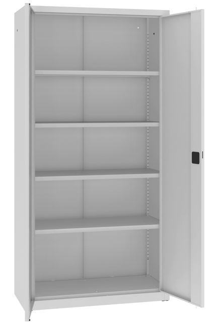 Hier handelt es sich um einen Metallschrank mit Flügeltüren. Der versenkte Türgriff ist mit einem Sicherheitszylinderschloss ausgestattet, der die Tür mit einem Verriegelungsmechanismus an zwei Punkten sichert. Integrierte Gummipuffer sorgen für eine Geräuschdämmung beim Schliessen der Türen. Die Fachböden sind alle 25 mm einstellbar. Die Tragfähigkeit beträgt 65 kg pro Fachboden. Der Korpus ist komplett verschweisst und sehr robust gefertigt. Der Metallschrank muss nicht zusammengebaut werden, wodurch er an Festigkeit und Stabilität gewinnt. Der Korpus ist mit Gleitern am Schrankboden ausgestattet, die ein leichtes Verschieben des Schrankes ermöglichen.