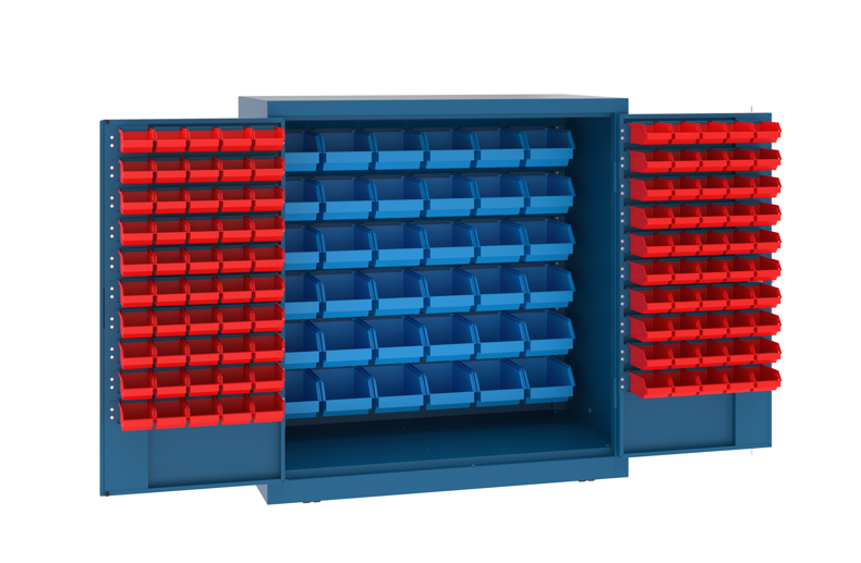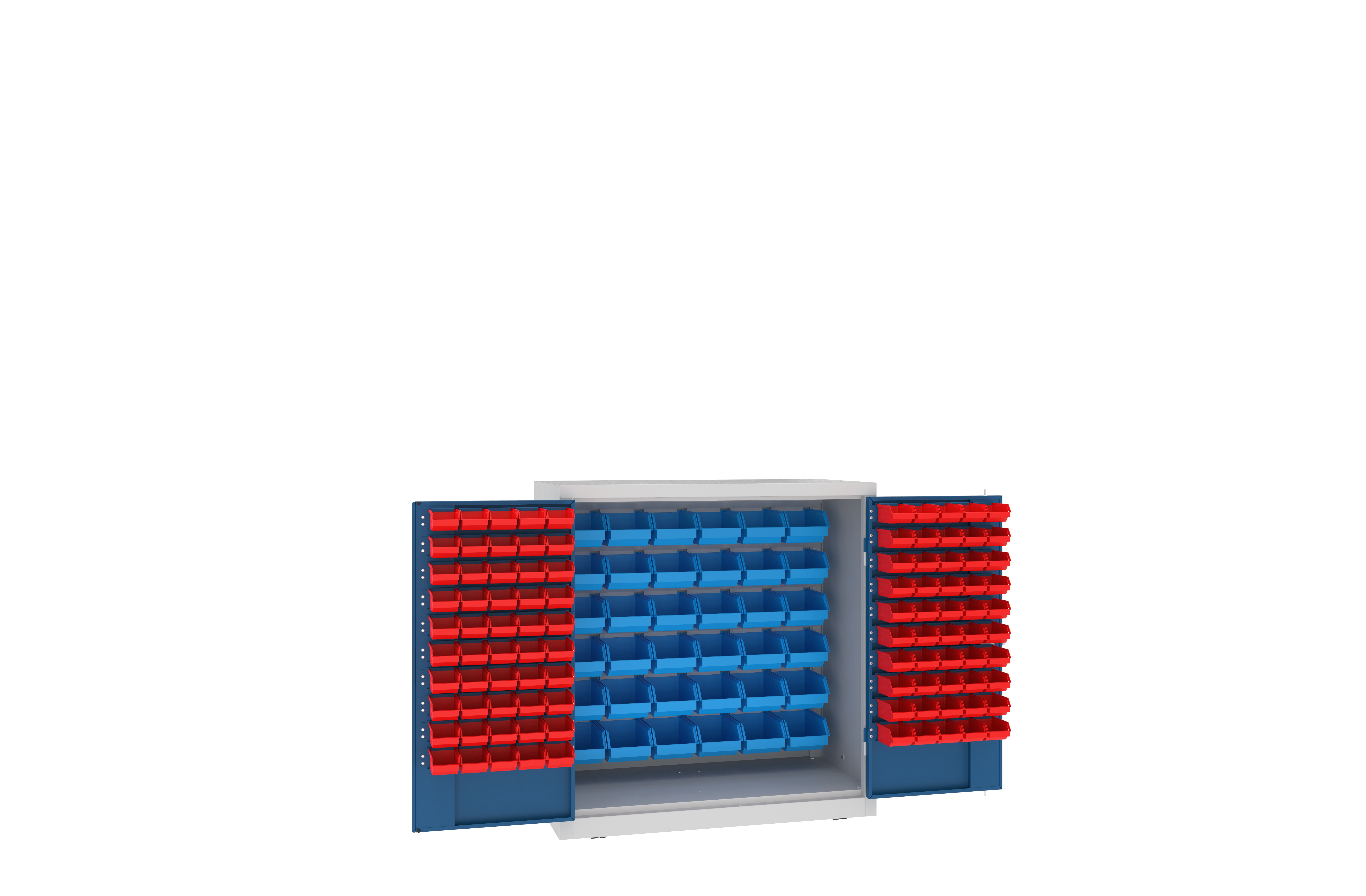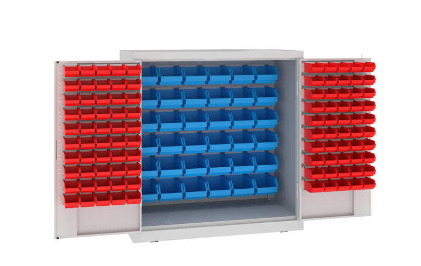 Anzahl Behälter: 36 Stück , Abmessungen: 224 × 114 mm Anzahl Behälter: 100 Stück , Abmessungen: 119 × 77 mm Material: Korpus und Türen aus 1 mm Stahlblech Maximale Korpusbelastung: 400 kg Flügeltüren mit 3-Punkt-Verriegelung Drehgriff mit Zylinderschloss, inklusive 2 Schlüsseln...