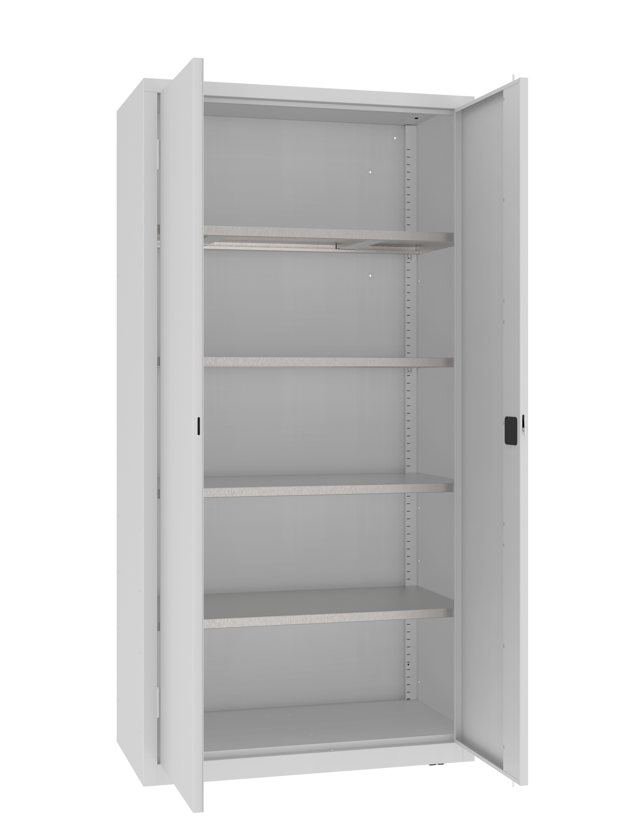 4 verzinkte Fachböden Verstärkte verzinkte Fachböden mit einer Tragkraft von 100 kg Material: Korpus und Türen aus 1 mm Stahlblech Maximale Korpusbelastung: 700 kg Flügeltüren mit 3-Punkt-Verriegelung Drehgriff mit Zylinderschloss, inklusive 2 Schlüsseln Herausnehmbare...