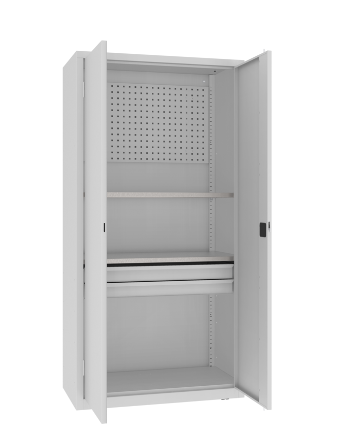 2 verzinkte Fachböden + Block von 2 Schubladen + Werkzeugwand Verstärkte, verzinkte Fachböden mit je 100 kg Tragkraft Schubladen mit 40 kg Tragkraft Fachböden und Schubladenblöcke alle 25 mm verstellbar Umfangreich erweiterbar durch zusätzliches Zubehör Material: Korpus und Türen...